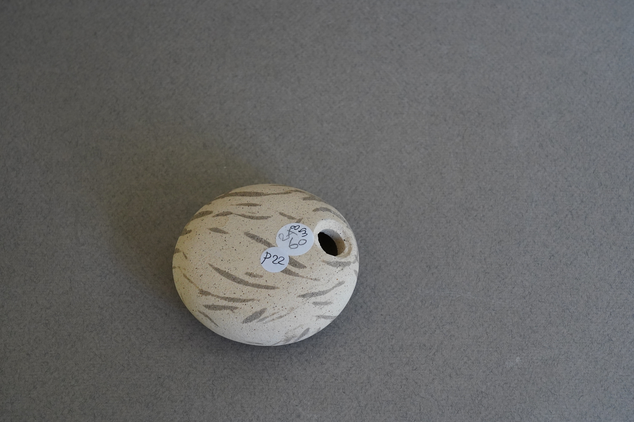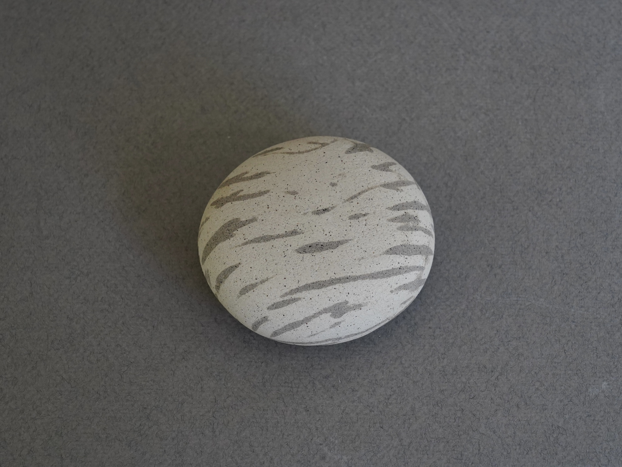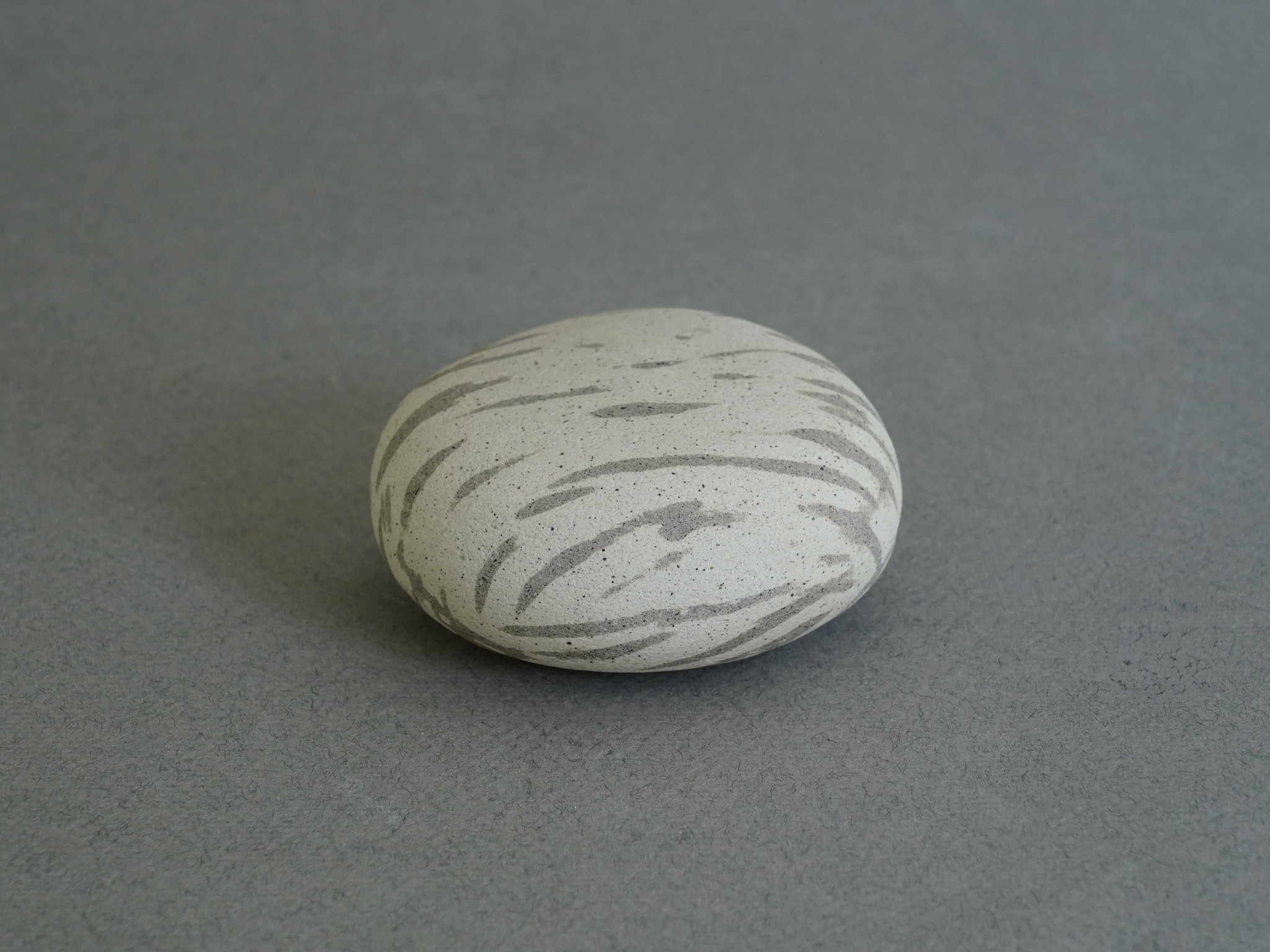 Deze Pebble is gemaakt van de zandkleurige klei met kleine spikkeltjes en heeft een patroon met een donker zandkleurige klei.